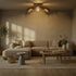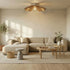 La lumière se diffuse entre les pales et se reflète sur le plafond. La finition chêne réchauffe l’éclairage et crée une ambiance enveloppante, idéale pour un salon, une chambre ou un couloir.