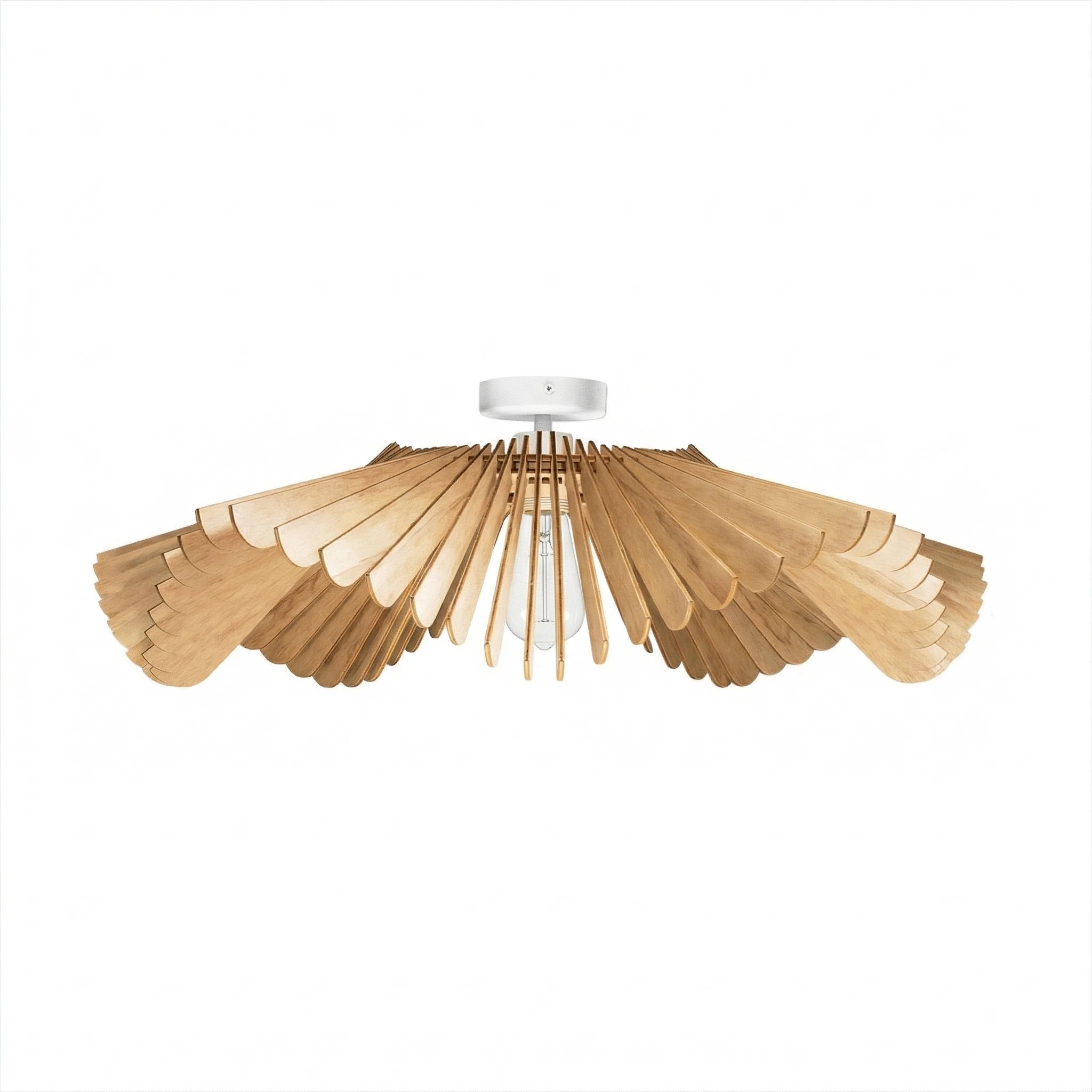Inspiré par une fleur en mouvement, son design sculptural déploie des pales en bois qui semblent s’ouvrir au plafond. La teinte chêne vient accentuer ces courbes, révéler les reliefs et donner plus de profondeur à cette silhouette organique.